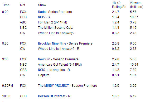 NCIS και NCIS:LA ξεκίνησαν με 3.4 και 3.0 αντίστοιχα ενώ το Person of Interest δέχτηκε ισχυρό πλήγμα με την αλλαγή slot και το 2.3 το έφερε στην 2η θέση.