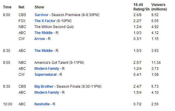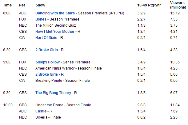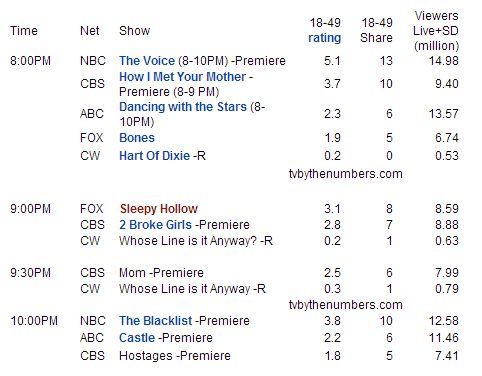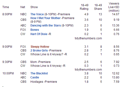 Δυναμική αρχή για το NBC με το The Voice να επιστρέφει στο 4.9 (+0.7 απ'την περσινή πρεμιέρα, +0.1 απ'την Άνοιξη) και το Blacklist να κερδίζει άνετα στις 10 με 3.8. Συγκριτικά πέρσι το Revolution ξεκίνησε με 4.1 ενώ είχε και χαμηλότερο lead-in.